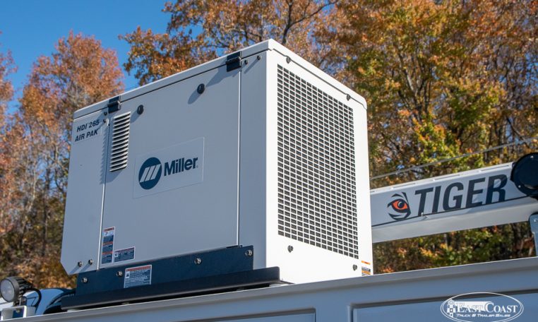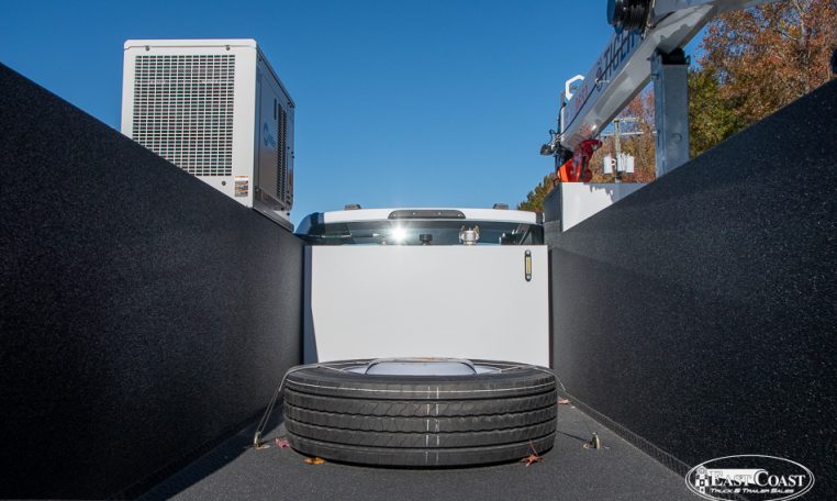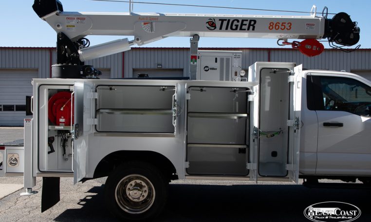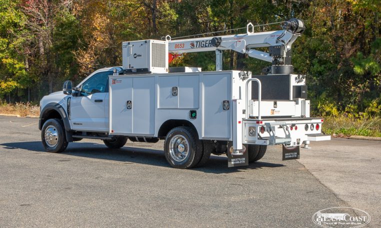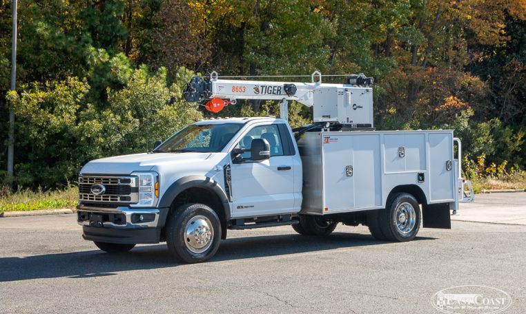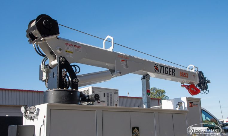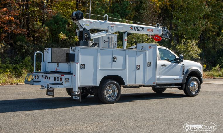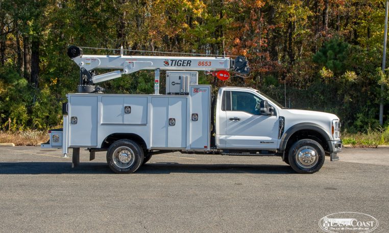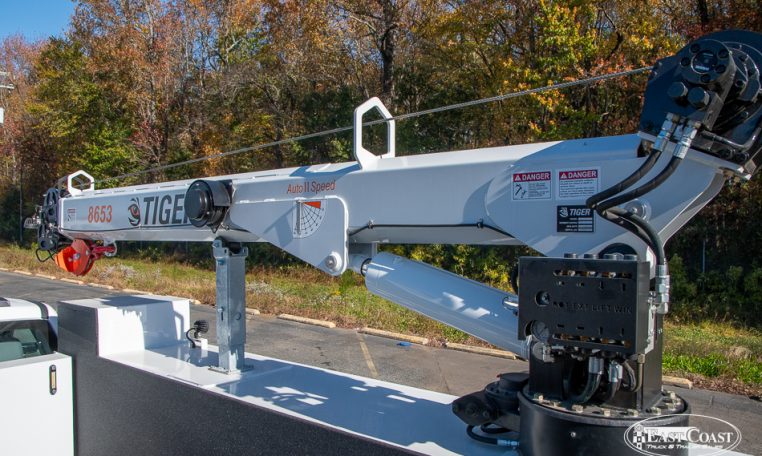This setup is completed with the Tiger 8653 hydraulic crane, delivering up to 8,600 lbs of lifting capacity and a 30.5-foot hydraulic reach. Ideal for long-reach work on lighter chassis, the 8653 features Auto II Speed Control, which automatically reduces crane speed under load for smooth, precise handling. A wireless proportional remote with a digital load display ensures visibility and control from start to finish.