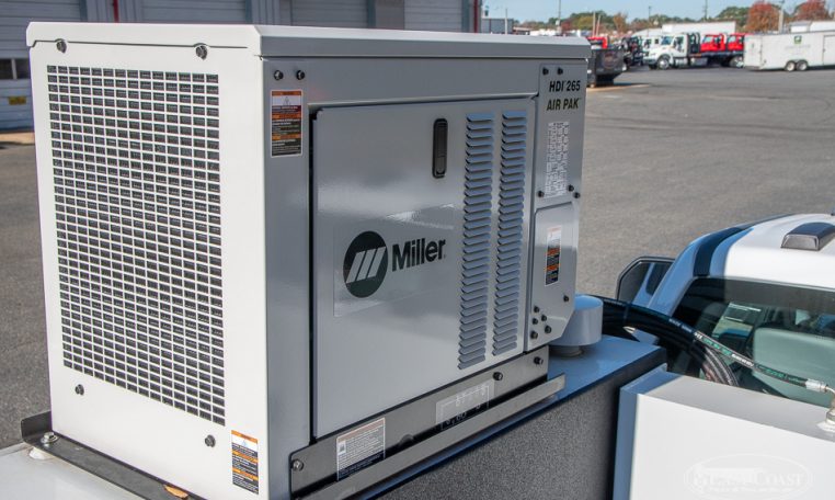 The mounted HDI 265 Air Pak is built for demanding work truck applications, delivering 30–265 amps of DC welding power with a 265A @ 30V, 100% duty cycle output. It supports a 1/4 in. (6.4 mm) rated carbon diameter and provides reliable auxiliary power with 7,000 W continuous and 7,500 W peak single-phase output. Noise levels remain manageable at 62 dB (no load) and 74 dB (under load) measured at 7 meters. The unit features a Rotorcomp compressor offering 40 cfm of free air delivery, 90–175 psig working pressure, a 100% duty cycle, and automatic shutdown at 200 psi for protection. Hydraulic performance includes a 3,000-psi max pressure and an 11 gpm supply requirement, while onboard charging supports 12/24-volt systems up to 150 amps.