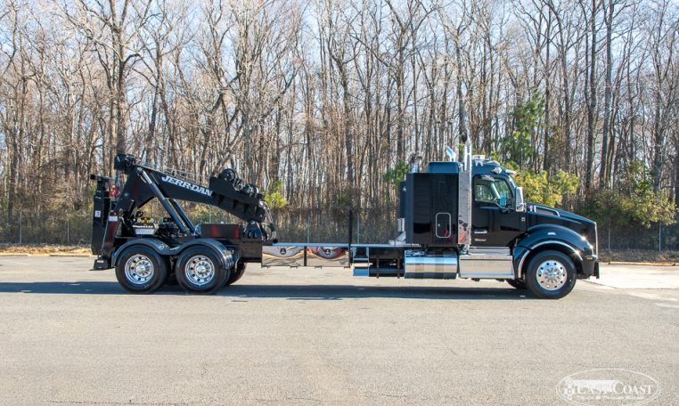 This new 2024 Kenworth T880 with Sleeper, outfitted with a Jerr-Dan 25-Ton Integrated Wrecker, is a dedicated tow truck built with long-haul work in mind.