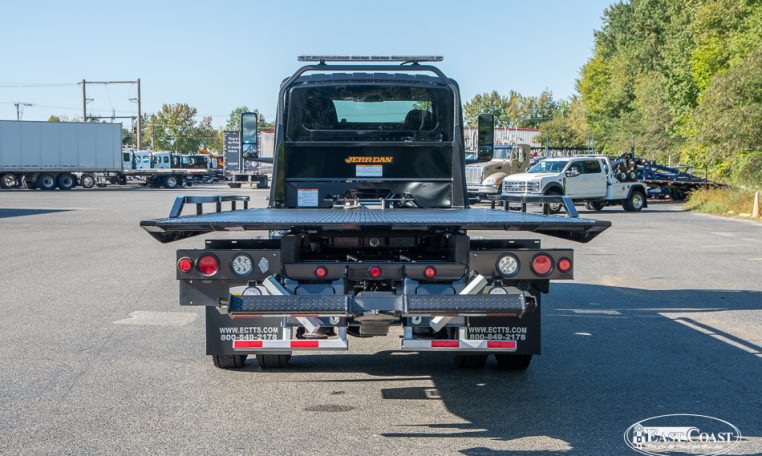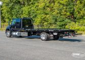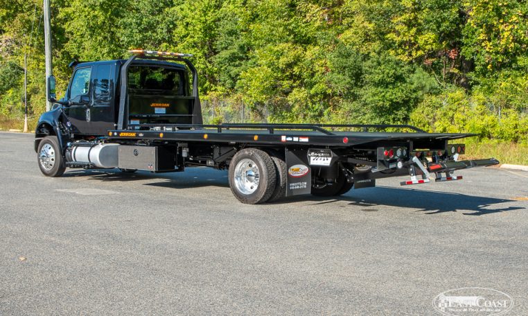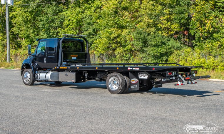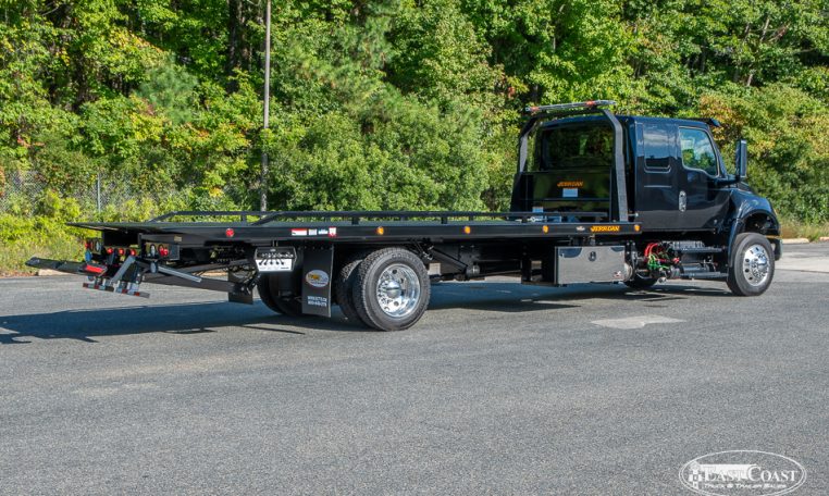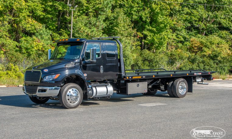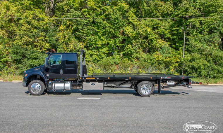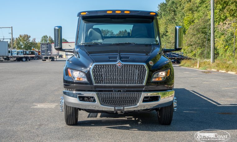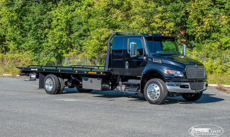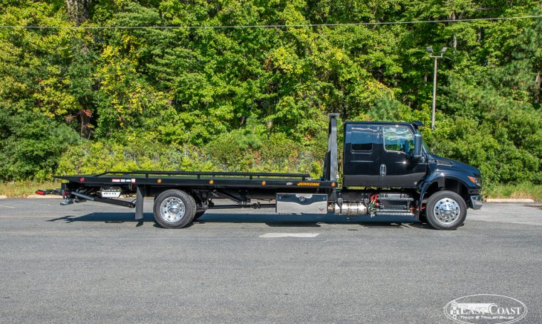 This new 2026 International MV and Jerr-Dan 22×102 SRR6T-LPW in black steel rollback, is equipped with a 250HP Cummins Engine, Allison 2200 RDS Automatic Transmission, 4.63 Rear Ratio, a 250″ Wheelbase, Air Brakes, Power Steering, and AC.