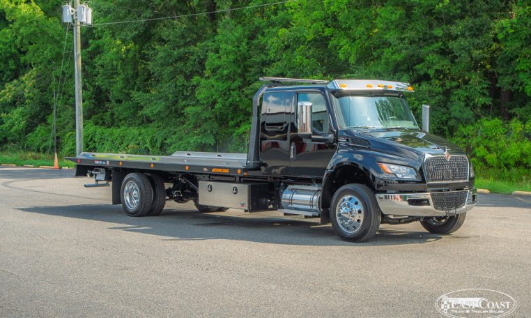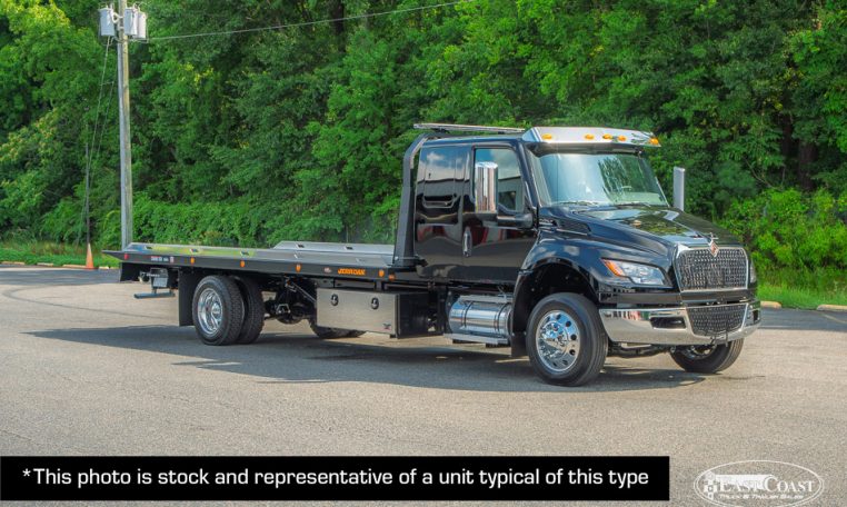 This new 2026 International MV Extended Cab Truck and Jerr-Dan 22×102 SRR6T-LPW in Black STEEL Rollback, is equipped with a 300HP Cummins Engine, Allison 2200 RDS automatic transmission, 4.63 rear ratio, a 250″ wheelbase, and Air Brakes.