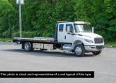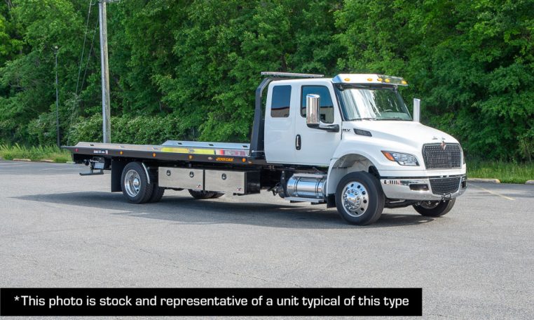 This new 2026 White International MV Extended Cab Truck and Jerr-Dan 22×102 SRR6T-LPW STEEL Rollback, is equipped with a 300HP Cummins B6.7L 6 Cylinder Engine, Allison 2200 RDS automatic transmission, 4.63 rear ratio, a 250″ wheelbase, Air Brakes, Power Steering, and AC.