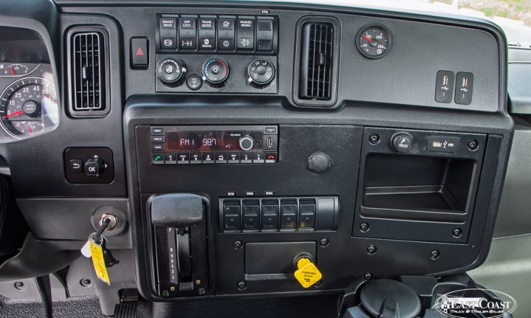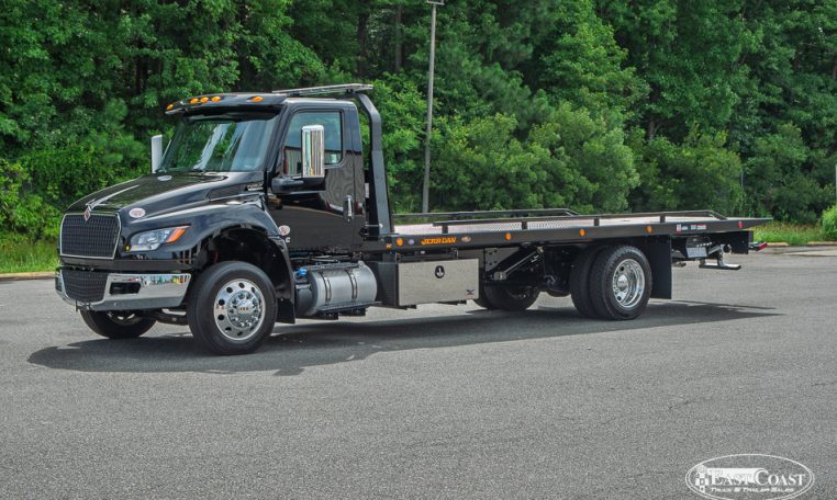 This new 2026 International MV and Jerr-Dan 22×102 SRR6T-LPW in black steel rollback, is equipped with a 250HP Cummins Engine, Allison 2200 RDS Automatic Transmission, 4.63 Rear Ratio, a 224″ Wheelbase, Air Brakes, Power Steering, and AC.